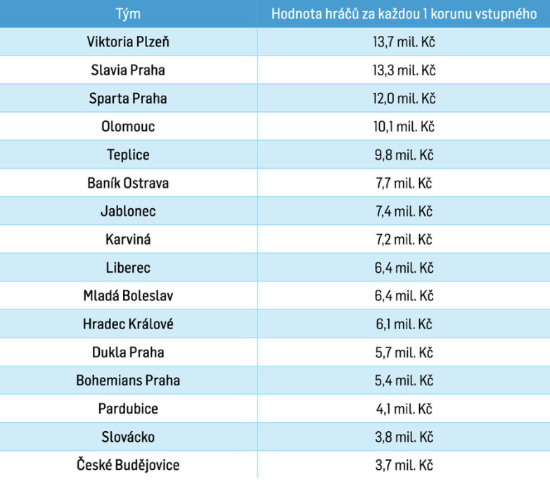 V tomto ukazateli kraluje západočeská Viktoria Plzeň. Každá koruna, kterou fanoušek Plzně za sezónu zaplatil na vstupném, mu přinesla možnost sledovat hráče s průměrnou hodnotou 13,7 milionu korun. Na druhém místě skončila Slavia (13,3 milionu korun za korunu vstupného), třetí pak Sparta (12 milionů).