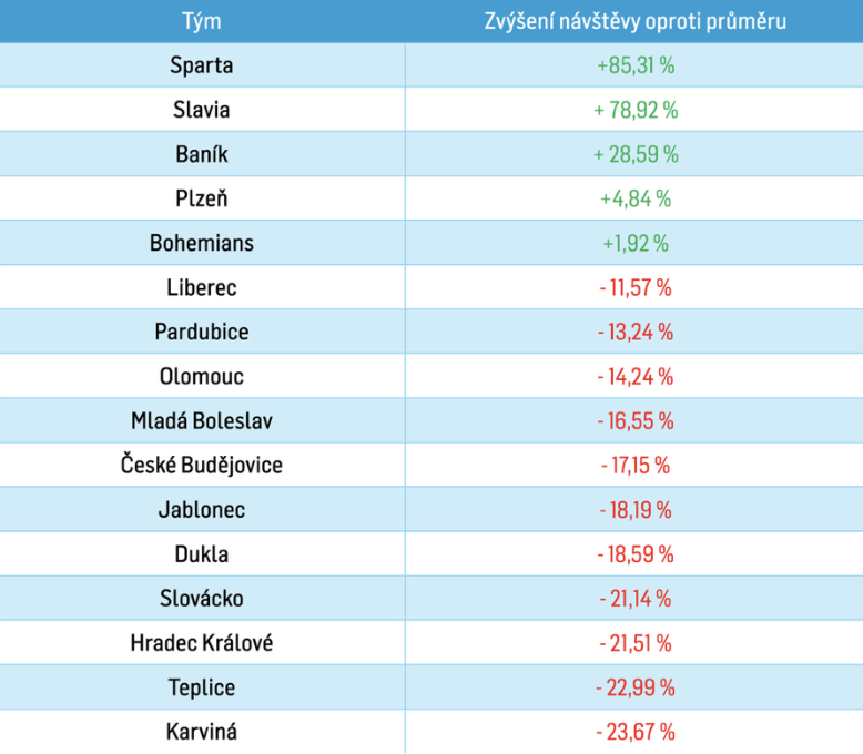 Výsledky jsou jednoznačné. Největší tahák pro ligu byla Sparta. Když přijela na hřiště soupeře, průměrná zaplněnost stadionu vzrostla o 85 procent oproti běžnému průměru daného klubu. Téměř stejný efekt měla Slavia, která zvedla návštěvnost o 79 procent. Vysoko se držel i Baník Ostrava s nárůstem přes 28 procent. Pozitivně pak do návštěv na hřištích soupeře promlouvala také plzeňská Viktoria a Bohemians Praha. Slovan se umístil na šestém místě.