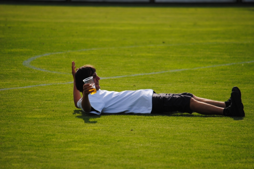 Pohodlnost trávníku o poločase zkoušeli i někteří fanoušci
