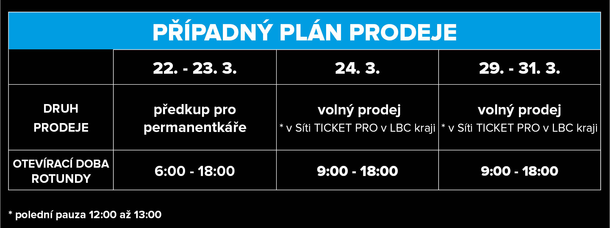 Ve čtvrtek 24. března bude zahájen volný prodej všech neobsazených míst v Home Credit Areně, tedy včetně těch sedadel, která byla v základní části obsazena permanentkou. „I pro volný prodej bude platit omezení maximálního počtu prodaných vstupenek na jednoho nakupujícího,“ doplnil Kadlec.