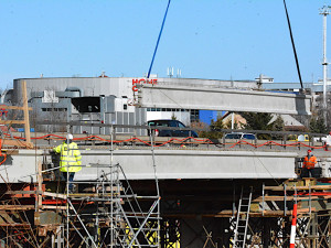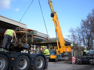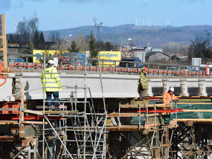 V těchto dnech probíhají nejviditelnější práce na výstavbě mostu u bývalého Baumaxu, kde už čtyřicetitunový jeřáb umísťuje na pilíře mostu nosníky. „V současné chvíli probíhá osazování předpjatých železobetonových nosníků. Každý den osazujeme jedno mostové pole, kam se osazuje čtrnáct nosníků, jeden váží zhruba dvanáct tun. Osazujeme to čtyřicetitunovým jeřábem,“ doplnil vedoucí úseku výstavby ŘSD Tomáš Šulc.