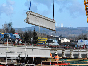Osazovat se budou ještě tři pole na přelomu dubna a května, poslední tři pole pak v červnu. „Poté se musí vybetonovat mostní deska, která spřáhne nosníky s konstrukcí,“ doplnil.