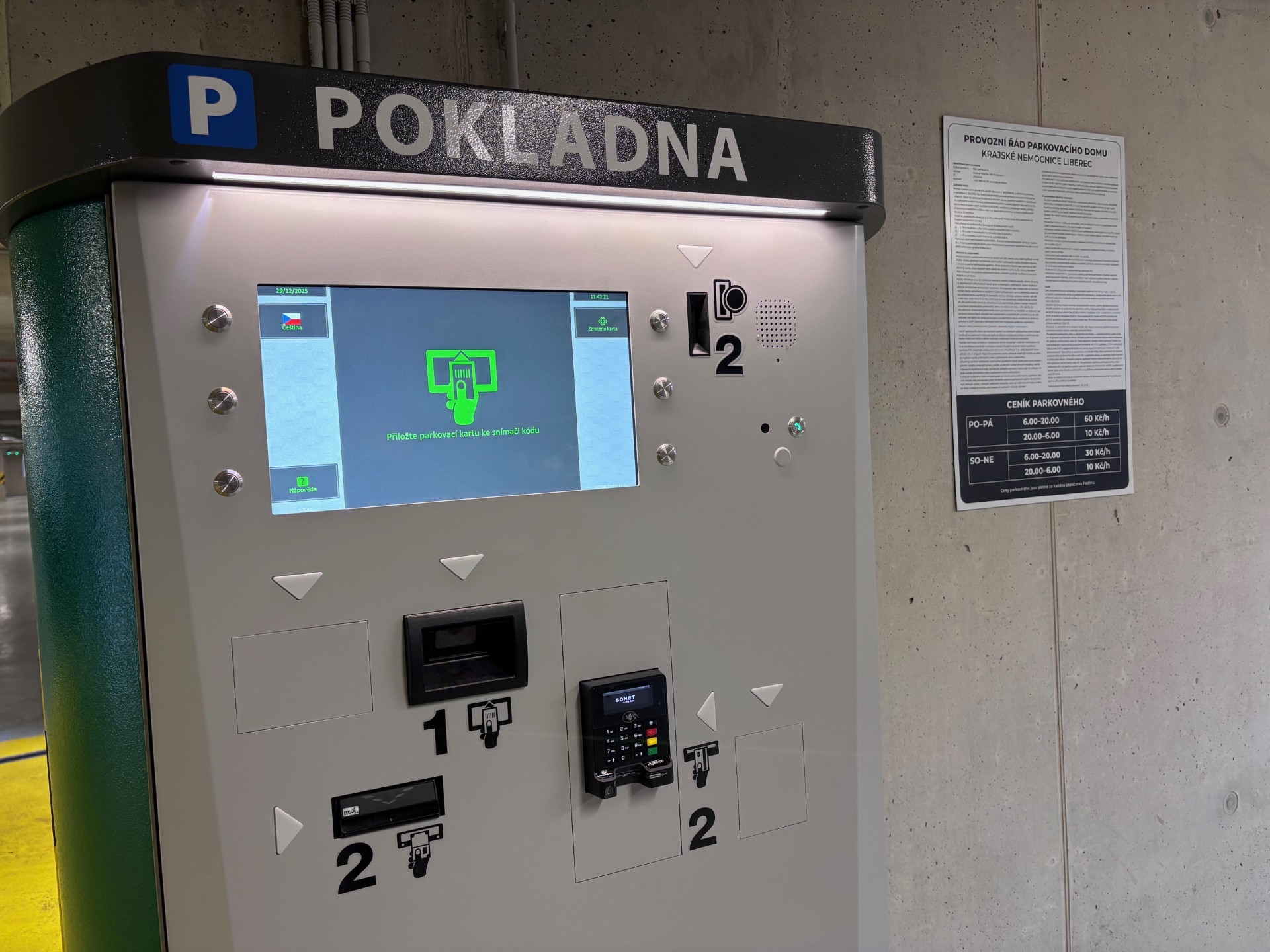 Do nového parkoviště se najíždí z Jablonecké ulice, k vjezdu slouží jedna závora, u které řidiči klasicky zmáčknou tlačítko a vyjede jim parkovací lístek. „Když parkování ukončí, zaplatí za parkovné v automatu buď v prvním podzemním podlaží nebo u výjezdu. Platit lze hotově nebo bezhotovostně, například platební kartou. Pokud řidič zaplatí v prvním podzemním podlaží, brána u výjezdu se mu automaticky otevře, parkoviště totiž snímá státní poznávací značky všech vozů, které do něj vjedou a závoru tak rovnou otevře. Času na přejezd k výjezdu mají řidiči dost, i kdyby si nejprve zaplatili parkování a pak teprve došli k autu a odjeli. Od zaplacení mají na opuštění parkovacího domu 15 minut,“ podotýká zástupce investora Petr Šmakal.