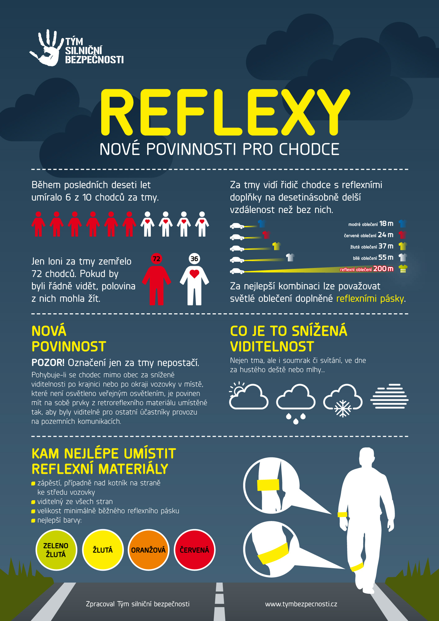 V průběhu února se Česká republika zařadí mezi země, ve kterých pro chodce platí povinnost nosit za snížené viditelnosti vhodné reflexní doplňky. Stanoví to zbrusu nový odstavec Zákona o silničním provozu. Jaká je minimální efektivní velikost reflexního doplňku, jeho správné umístění a zabarvení a nakolik se dá očekávat, že se české silnice za zhoršené viditelnosti rozsvítí?