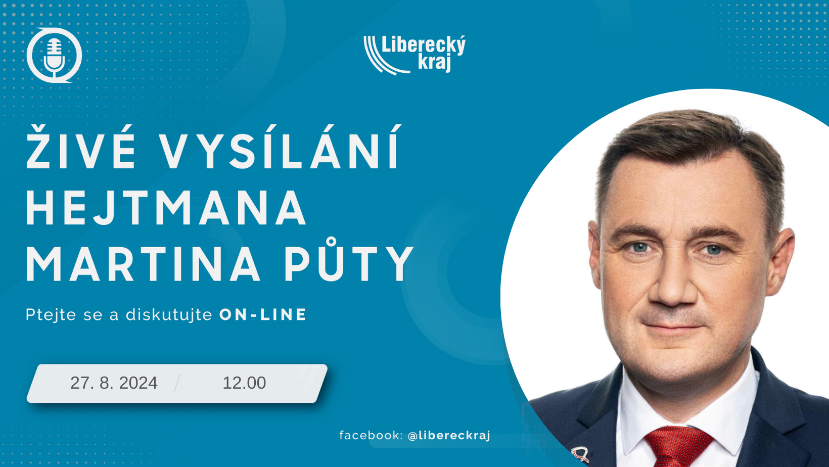 Hejtman Libereckého kraje Martin Půta (Starostové pro LK) bude v úterý 27. srpna od 12 hodin odpovídat na dotazy v online přenosu na facebooku Libereckého kraje. Dotazy hejtmanovi mohou už nyní v tomto článku pokládat i čtenáři Liberecké Drbny.