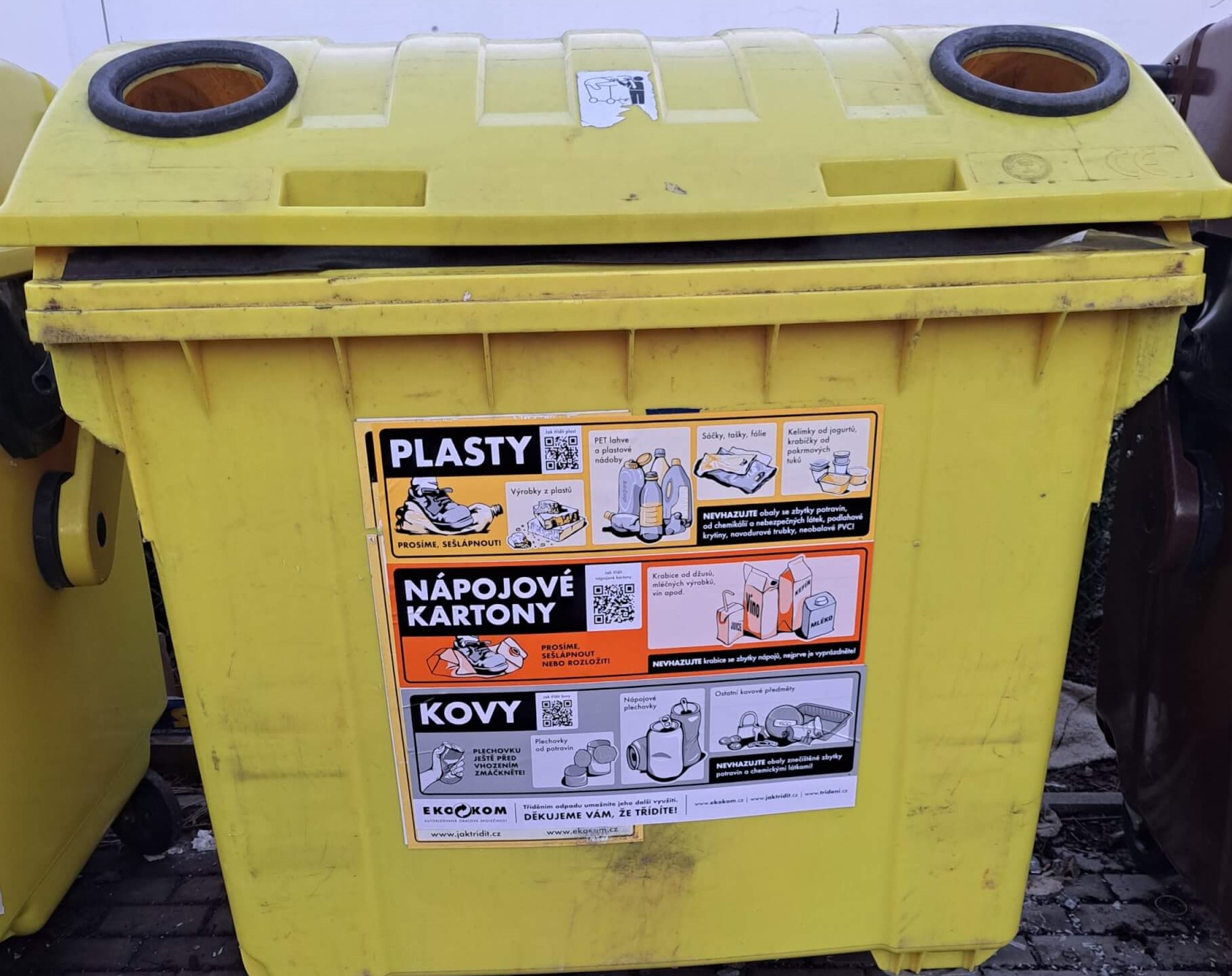 Když se například k plastům přidávají kovy, je žlutý kontejner opatřen samolepkou s označením kovového odpadu.
