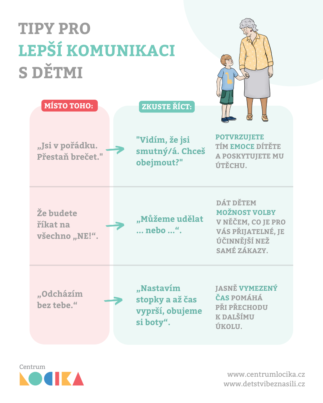 Centrum Locika nabízí řadu grafik s radami pro lepší komunikaci.Jak říká řada odborníků na dětskou psychologii, výchova bez fyzických trestů není synonymem „výchovy bez hranic“. Právě naopak, respektující výchova vychází z důslednosti, empatie a dlouhodobé práce na vztahu s dítětem, nikoli z trestání a strachu.