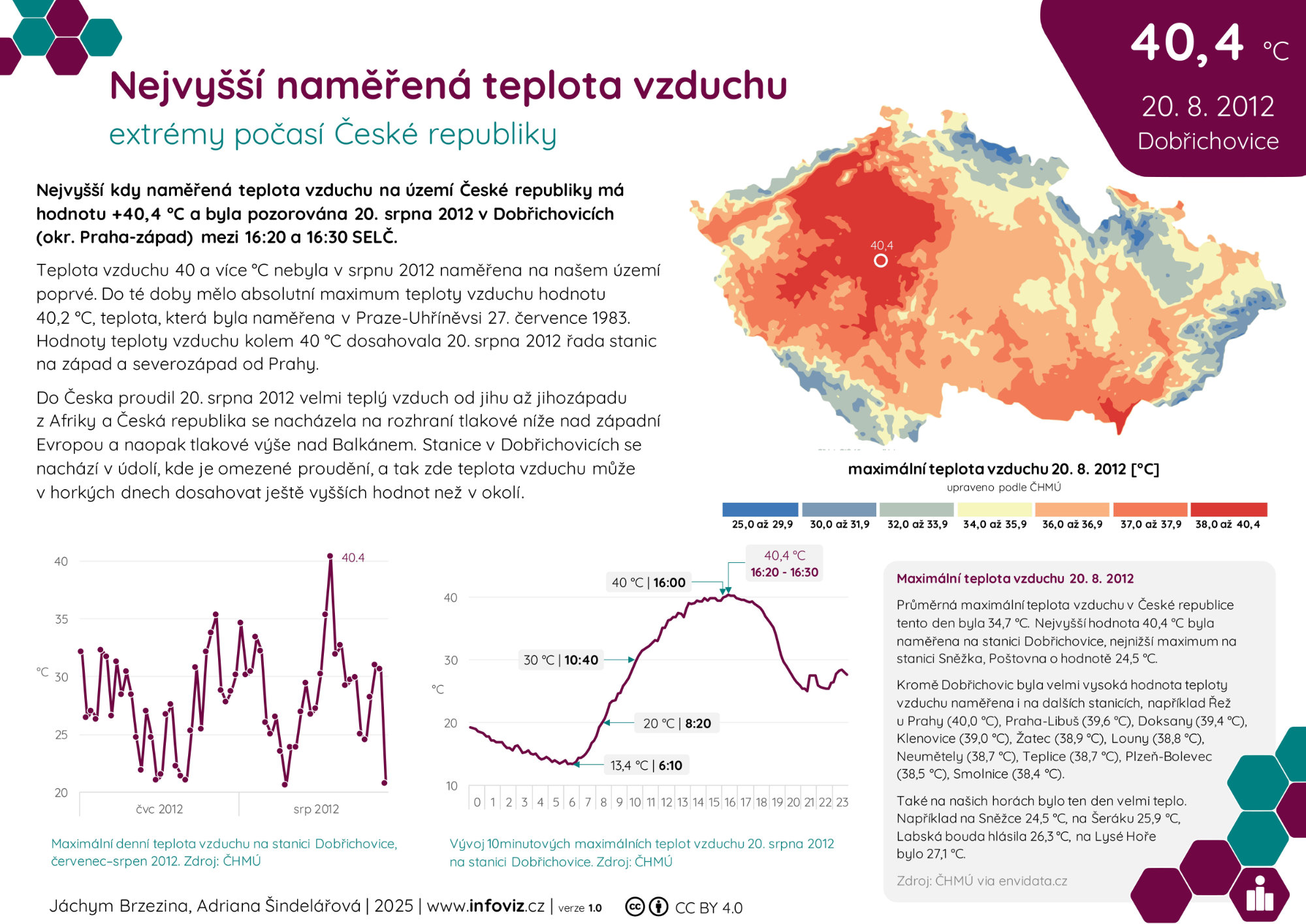Pro zajímavost uvádíme vůbec nejvyšší naměřenou teplotu v České republice v historii měření. Má hodnotu +40,4°C a byla pozorována 20. srpna 2012 v Dobřichovicích (Okres Praha - západ) mezi 16:20 a 16:30 SELČ.