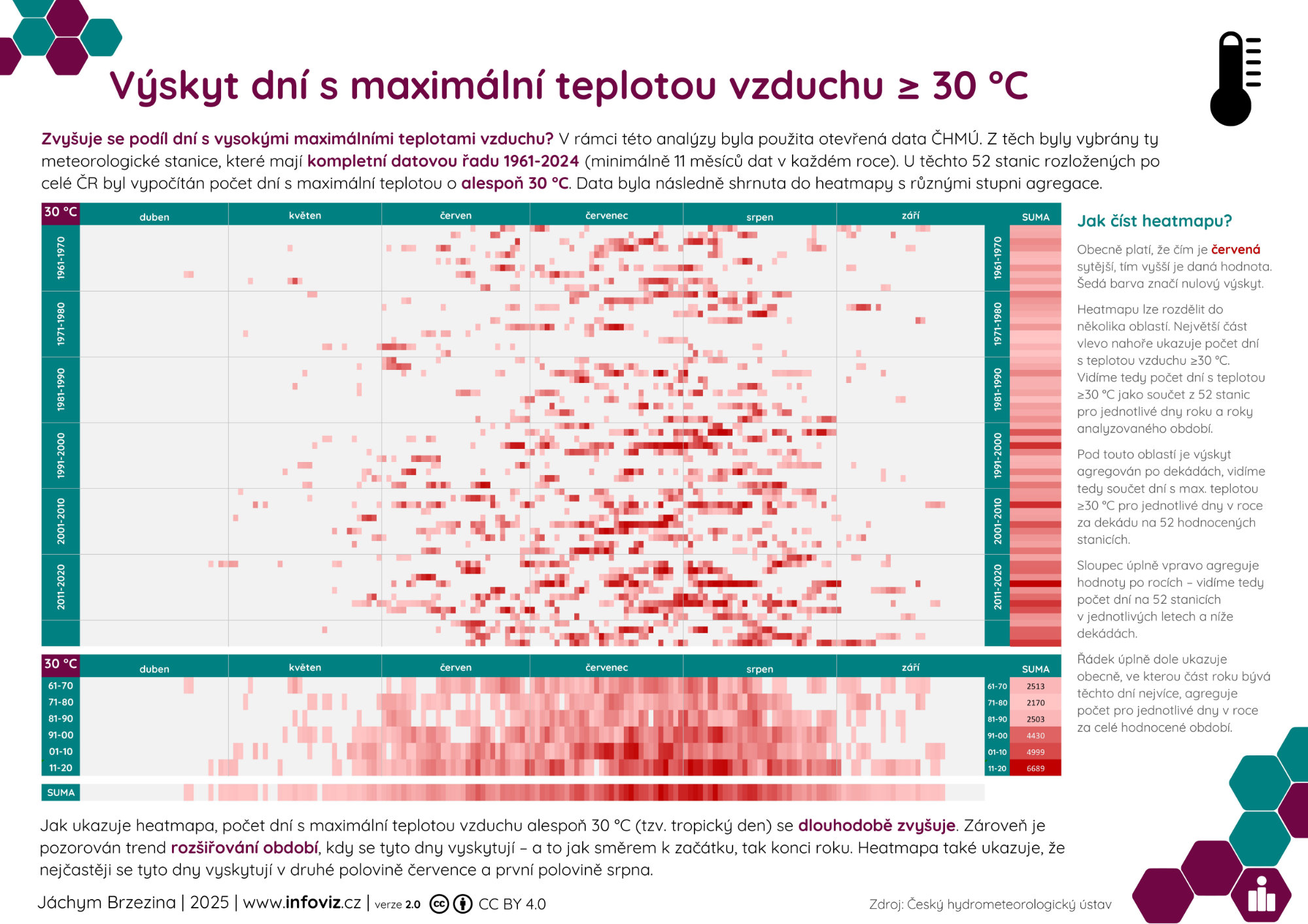 Infografika Jáchyma Brzeziny k vývoji množství tropických dnů.A jak to bylo dříve s teplotami ještě vyššími, tedy výrazně nad 35 °C? Teploty 36 °C, 37 °C nebo dokonce 38 °C se u nás před rokem 1980/1985 víceméně vůbec nevyskytovaly. Výrazný nárůst četnosti těchto dní přichází hlavně po roce 2000. Velmi vysoké teploty se v ČR objevily naposledy v tomto týdnu. V úterý vystoupala teplota na některých místech výjimečně až na 37 °C. Ve středu na jižní Moravě až 36 °C. "Výše prezentovaná data tedy jasně ukazují narůstající trend v případě tropických a extrémních teplot v posledních desetiletích. Jedná se samozřejmě o důsledek klimatické změny a vyhlídky do budoucna nejsou o nic lepší, ba naopak," uvádí na sociální síti Instagram Český hydrometeorologický ústav.