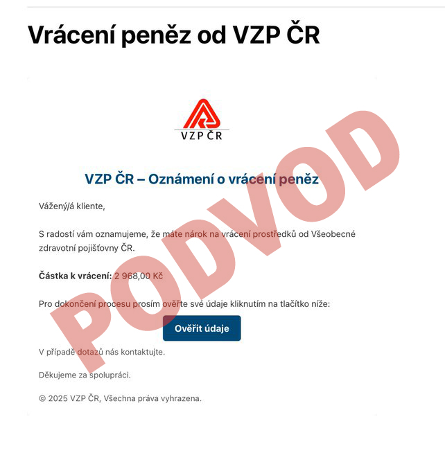 Internetoví podvodníci oprášili starý trik, jak vylákat z lidí citlivé údaje. Rozesílají falešné e-maily, které upozorňují na údajný nárok na vrácení přeplatků nebo příspěvků od Všeobecné zdravotní pojišťovny ČR (VZP ČR). Skutečným cílem je ovšem získat přístup k bankovním účtům a připravit oběti o peníze. Všeobecná zdravotní pojišťovna důrazně varuje, že se jedná o podvod.