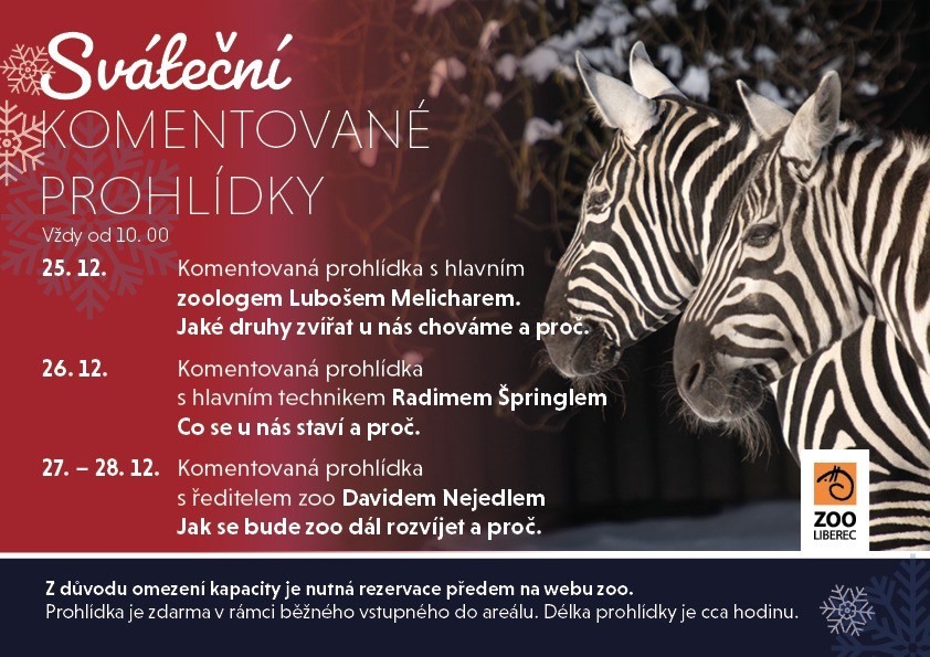 Od čtvrtka 25. do neděle 28. prosince připravila zoo pro návštěvníky speciální komentované prohlídky se zástupci vedení zahrady. „Začínají vždy v 10 hodin. Ve čtvrtek bude po zoo provázet hlavní zoolog Luboš Melichar a mluvit bude o zvířatech v naší zoo. V pátek se bude hovořit o aktuálních a plánovaných stavbách, opravách a rekonstrukcích a průvodcem po zoo bude hlavní technik zahrady Radim Špringl. Sobotní a nedělní procházkou provede návštěvníky ředitel zoo David Nejedlo a mluvit bude o rozvoji a budoucí podobě zahrady,“ uvádí mluvčí zahrady.
