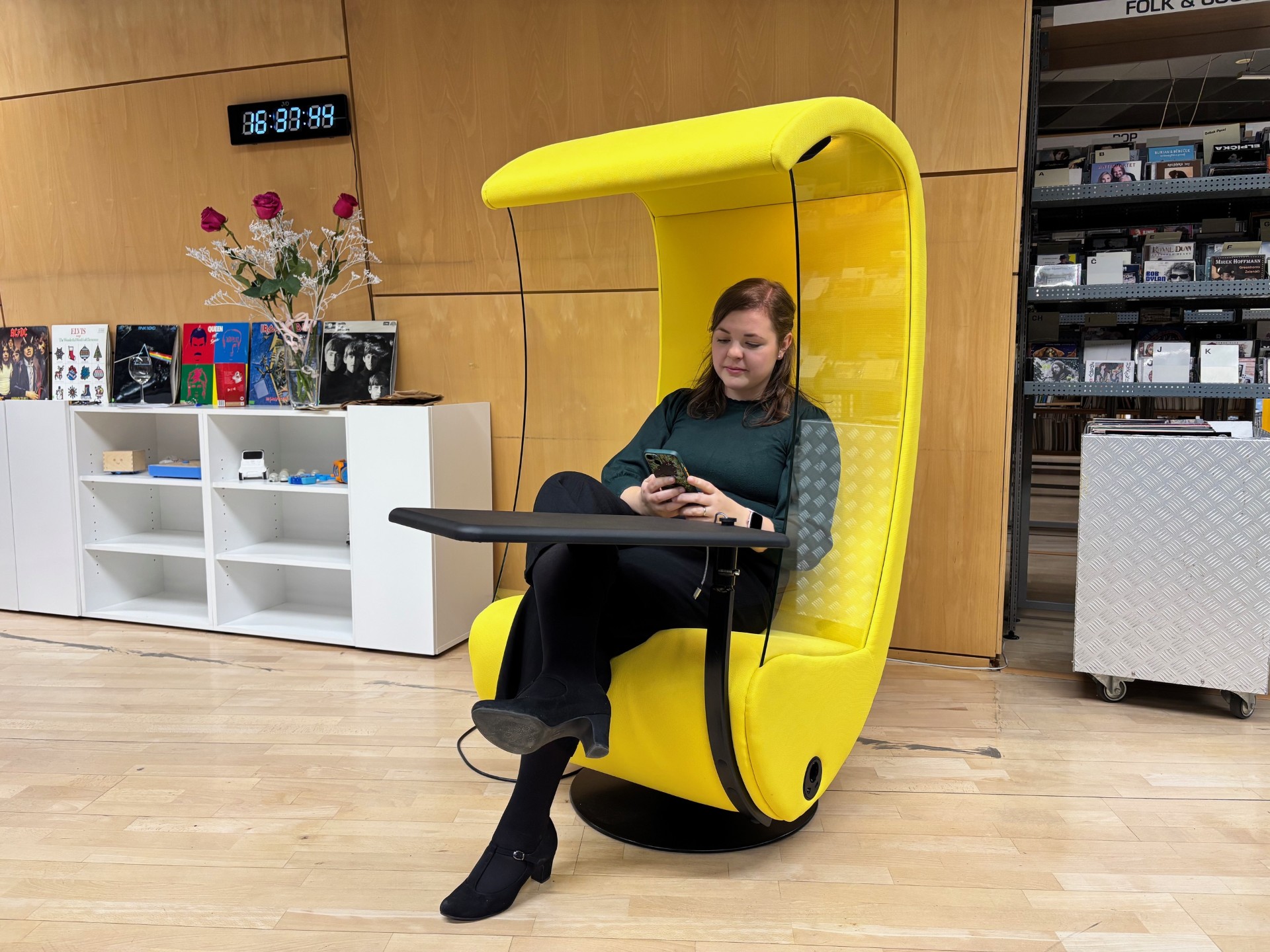 Součástí nové výbavy knihovny je i akustické křeslo – designově výrazný prvek oblíbený v zahraničních knihovnách. Nabízí návštěvníkům tiché místo pro poslech hudby či práci na notebooku, aniž by rušili okolí či sami byli rušeni. „Je to takový obrovský reprák. Posadíte se do něj, připojíte si na konektor počítač, telefon nebo tablet a můžete si tam poslouchat hudbu, audioknihu nebo studovat. Vy to tam slyšíte krásně, ale ven ten zvuk nejde téměř vůbec a vy zase neslyšíte zvuky zvenčí,“ vysvětluje vedoucí kreativní knihovny.