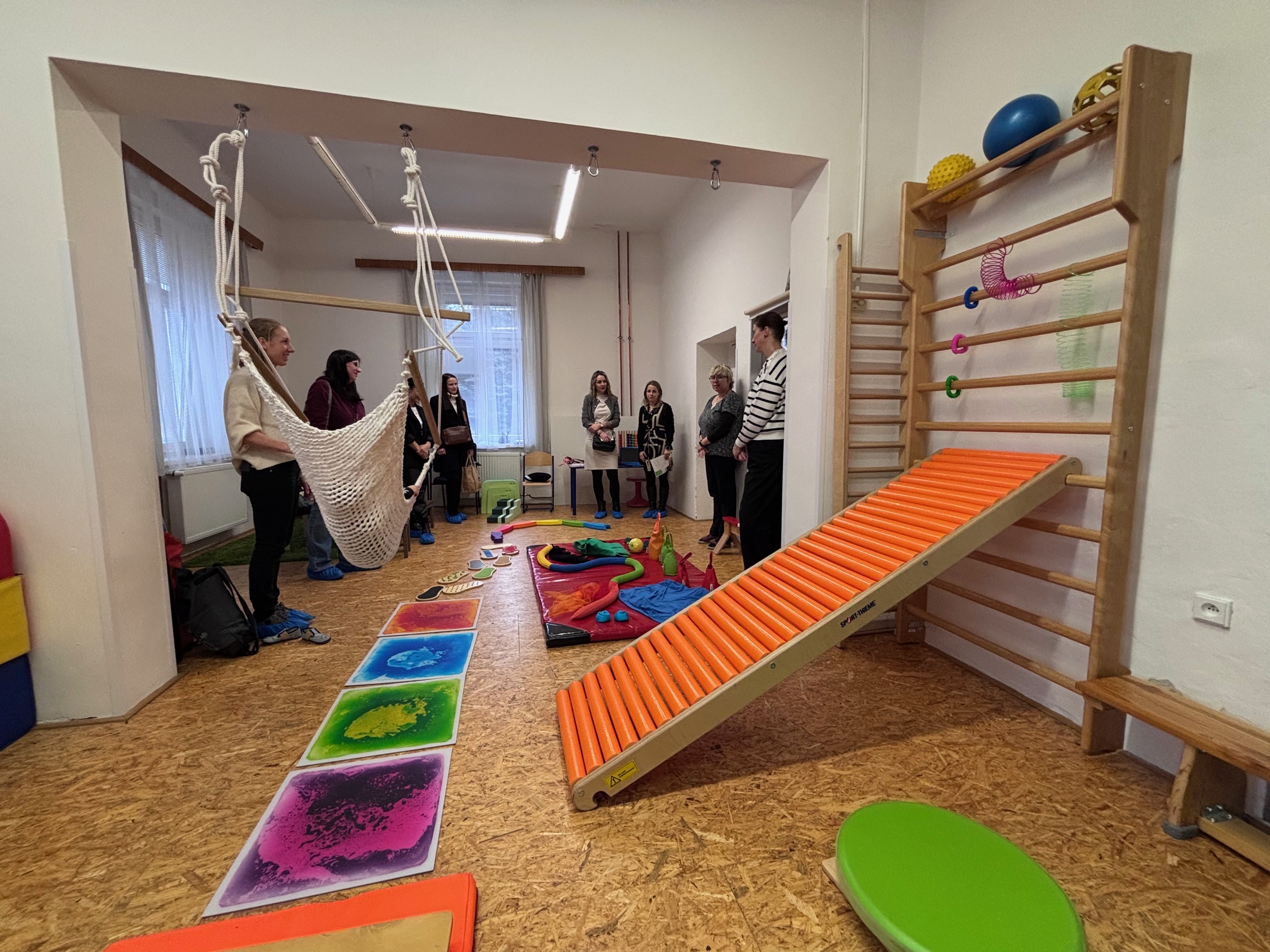 Ve druhé místnosti, které se v Liře říká pracovně tělocvična, se návštěvníci dnes dozvěděli o senzorické integraci. „Je potřeba, aby dítě velmi dobře vnímalo své tělo, které má ale často nějakým způsobem narušené. My se v této místnosti proto zaměřujeme na to, v které té oblasti to dítě potřebuje podpořit, protože díky tomu se zase může posouvat dál, ať už v nějakém celkovém psychomotorickém vývoji nebo v komunikaci. Všechno vždycky souvisí se vším,“ uvádí Jírová.
