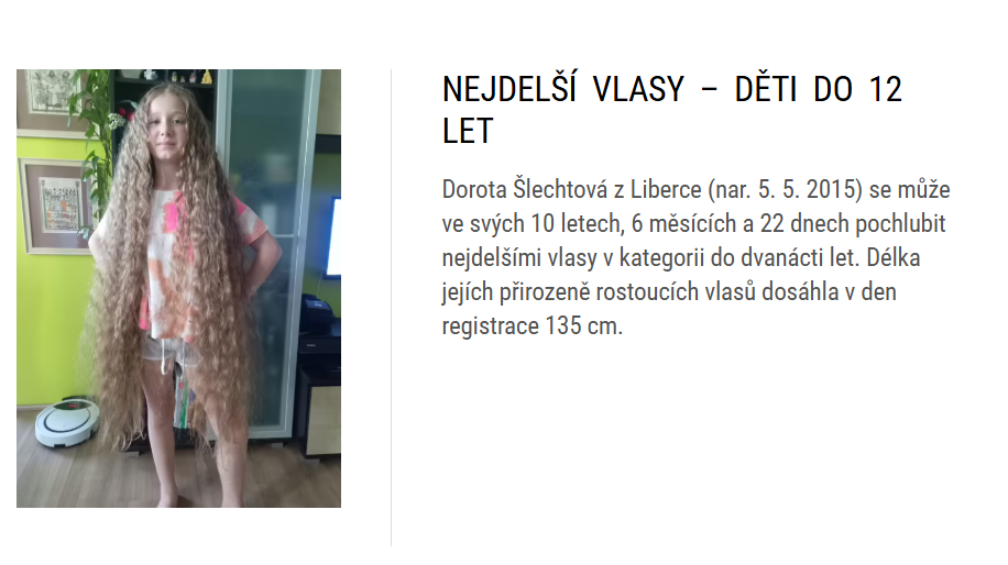 Od listopadu loňského roku byla desetiletá Dorota Šlechtová z Liberce oficiálně majitelkou nejdelších vlasů v České republice v kategorii do dvanácti let. Tehdy byly její přirozeně rostoucí vlasy dlouhé 135 cm. Od té doby ještě povyrostly, nicméně teď už tak úctyhodné délky nedosahují. Dorotka si totiž jejich část nechala ostříhat a darovala je na paruku pro svou kamarádku z baletu, která trpí alopecií a zažádala si v Nadačním fondu Daruj vlasy o paruku. Právě nadačnímu fondu Dorotka své vlasy darovala, aby tvořily část paruky pro kamarádku.
