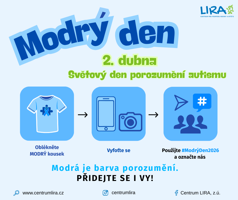 Centrum LIRA se do osvětové iniciativy Modrý den zapojuje už po několikáté. A vyzývá veřejnost, školy i firmy, aby se přidaly. „Stačí jednoduché gesto – obléct si modrou barvu nebo zvolit modrý doplněk, sdílet myšlenku dál a nebo otevřít téma ve svém okolí. Cílem je dostat téma porozumění mezi co nejvíce lidí a ukázat, že i malé gesto může mít velký dopad. Právě tak vzniká prostředí, kde se lidé s autismem mohou cítit přijatí,“ vysvětluje PR manažerka Centra LIRA Tereza Mayerová.