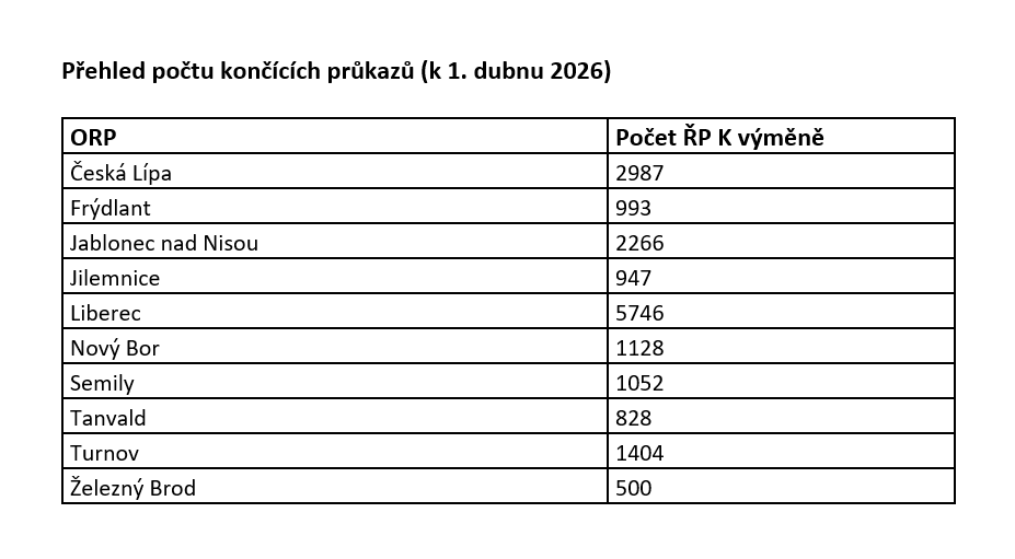 Výměna řidičského průkazu z důvodu vypršení platnosti je zdarma a lze o ni požádat nejdříve 90 dnů před koncem platnosti. Online žádost probíhá prostřednictvím Portálu dopravy, kde jsou automaticky předvyplněné údaje a celý proces tak probíhá v řádech sekund. Nový řidičský průkaz si lze za poplatek 100 korun vyzvednout na některém z 484 výdejních míst po celém Libereckém kraji. Současně zůstává možnost doklad vyzvednout i klasicky, bezplatně, na obecním úřadě s rozšířenou působností.